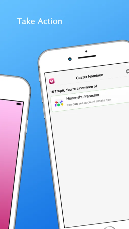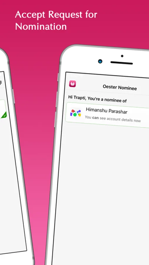 Nominee app works with Oester app. Someone using Oester app can nominate one's love one as a nominee. When this happens, the nominee can download the Nominee app and have option to view the account details of their nominator.