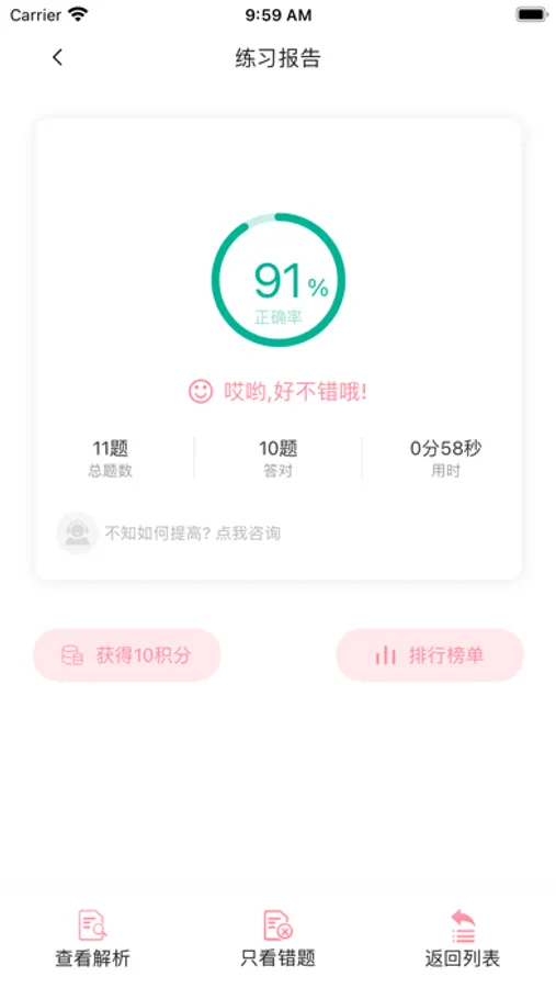 3.交卷后会提示本次考试情况(答对题数+正确率),几遍,提高薄弱点,再回到错题本,将错题再做一遍,必须达到60%以上的正确率,再进行下一个系统测试