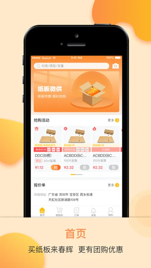 【首页】在首页可以实时看到春辉发布的材质信息及材质详情,一键下单无需等待响应,后台自动接单,提高采购效率。