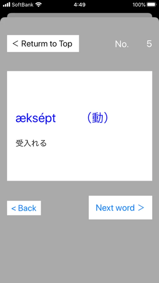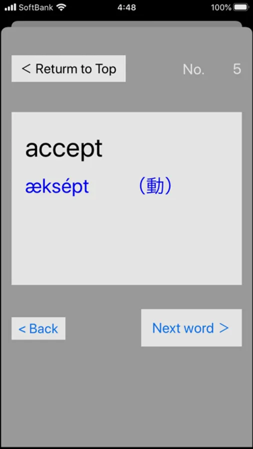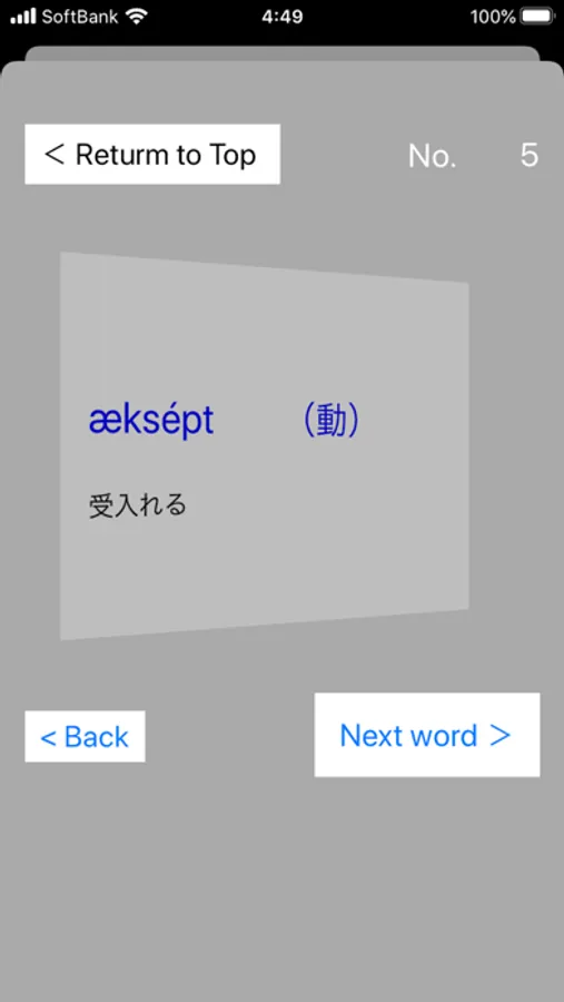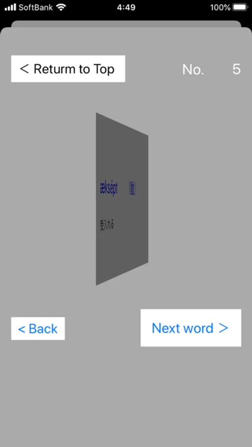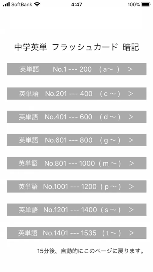 このアプリは英単語の暗記に最適です。英語と日本語のフラッシュ切替えを1秒ごとに行い、5秒後に次の単語に移ります。15分後に最初のTop画面に戻ります。「Next word」ボタンタップで覚えた単語をスキップし、「Back」ボタンで1つ前に戻ります。中学英語に必要な1535個の単語を発音記号と共に収録しました。暗記は何回も繰り返す事が効果的です。フラッシュ切替で暗記力・動態視力・速読力が身につきます。
