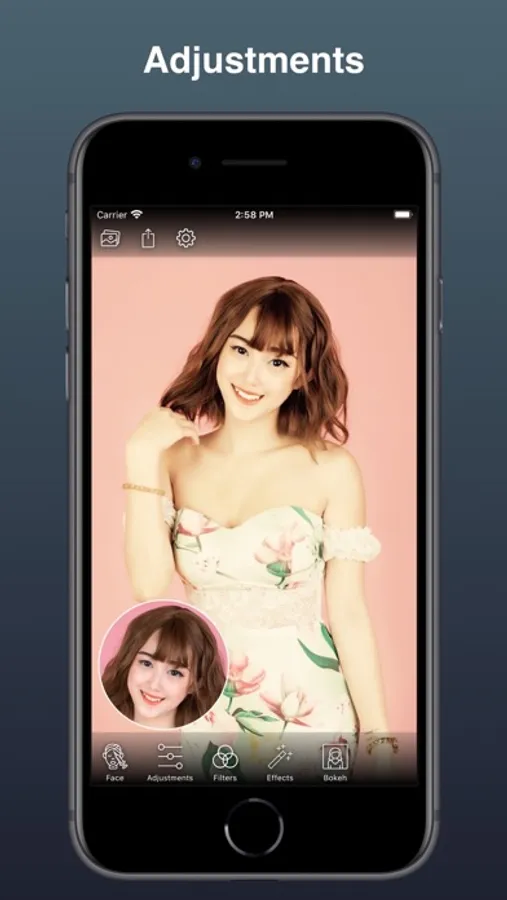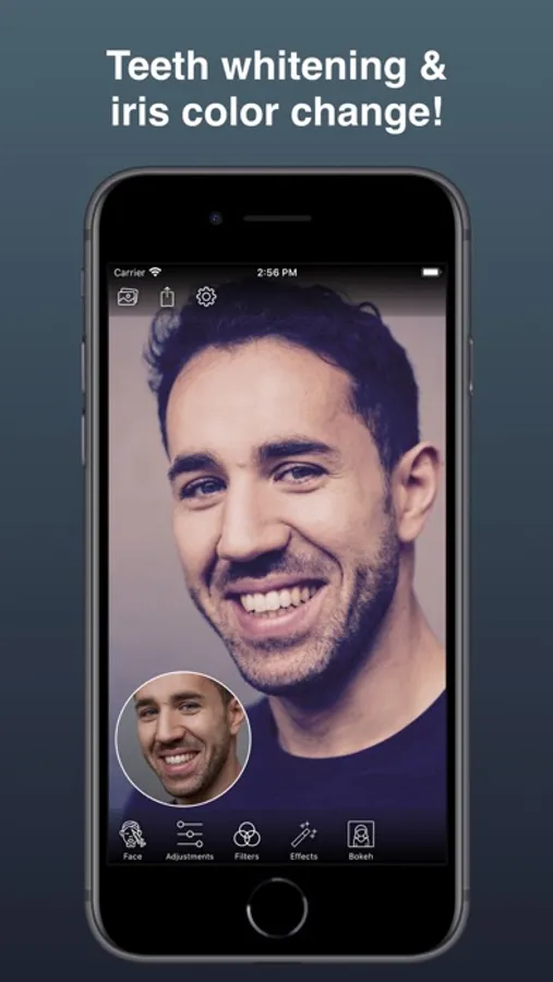 With this app you can adjust any imperfection on photo. Start with changes of your face parts. Resize nose, eyes, move eyebrows a little.