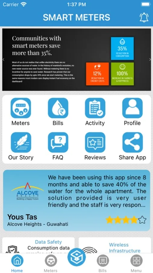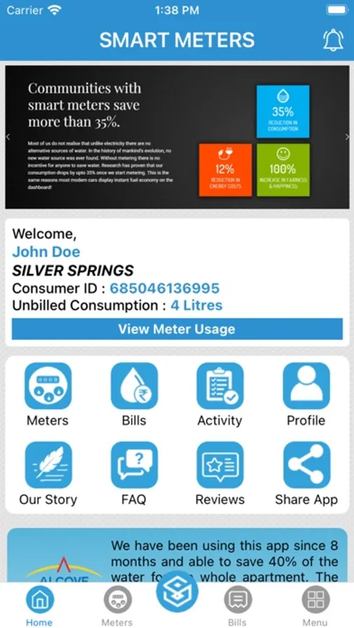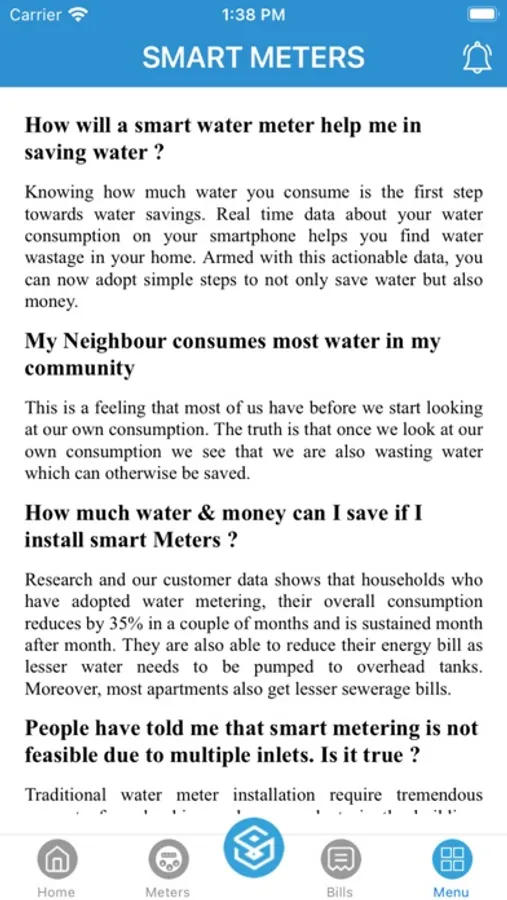 This app is meant to facilitate users of ‘Smart Water Meters'. These meters, having applications in domestic housing colonies as well as industrial setups, measure flow of water through a pipeline in terms of volume and transmit the data to a cloud server which can be accessed by users through this app. Users who purchase these meters, can first signup at www.smartwatermeters.in. By providing the login id, users can monitor and thereby control their personal water usage based on the readings they receive through this app. This app also has the ability to record earlier readings and display previous invoices.