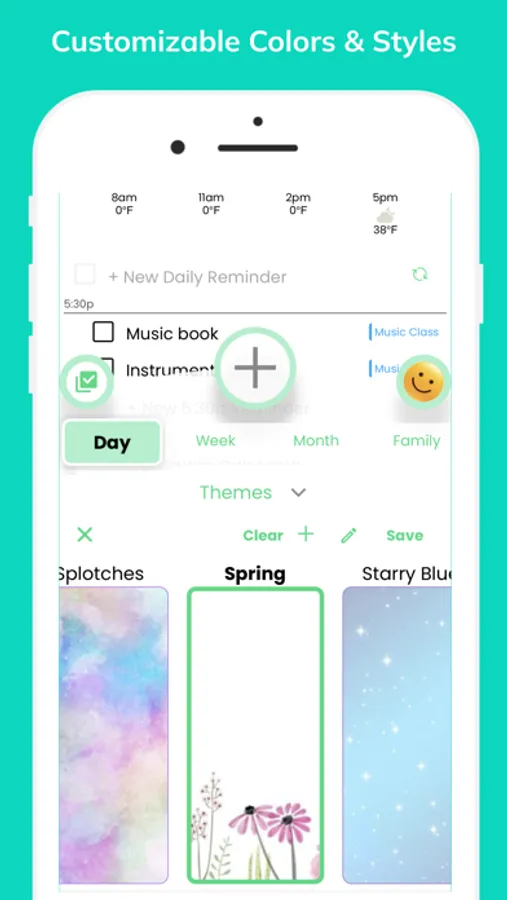 Choose from many different colorful themes, and set your preference for event styling and sizes on the calendar.