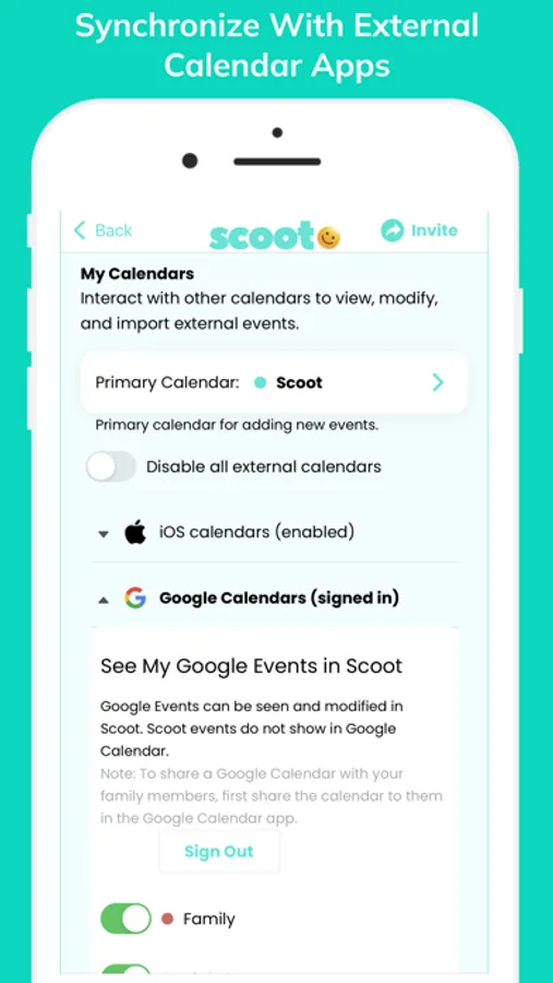 Scoot integrates smoothly with iOS calendar and Google calendar for families that need to keep using a combination of calendars. You can even import your other calendars into Scoot so it’s easier to manage everything from one place.