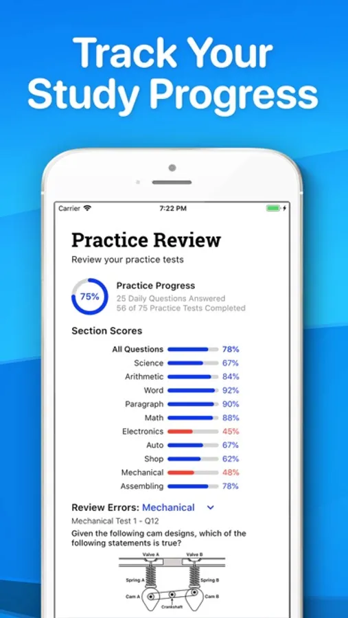 The ASVAB tests are designed to measure aptitudes in four domains: Verbal, Math, Science and Technical, and Spatial. The table below describes the content of the ASVAB tests. There are 10 sections in the ASVAB: General Science, Arithmetic Reasoning, Word Knowledge, Paragraph Comprehension, Mathematics Knowledge, Electronics Information, Automotive Information, Shop Information, Mechanical Comprehension, Assembling Objects. The Armed Forces Qualification Test (AFQT) is a component of the ASVAB that assesses candidates for placement into the Armed Services, and considers the Arithmetic Reasoning, Word Knowledge, Paragraph Comprehension and Mathematics Knowledge sections of the ASVAB. Our app covers all 10 sections of the ASVAB.