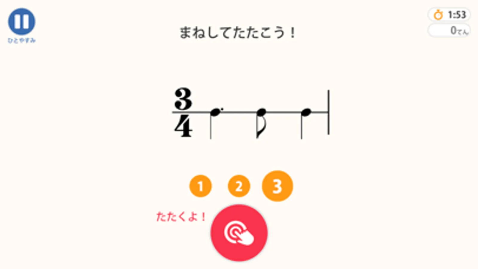 リズムに関する力を養います。楽譜に書かれたリズムの通りに画面をタッチする形式です。拍に合わせて正確に演奏する力を培い、頻出するリズムのパターンを網羅的に覚えることができます。