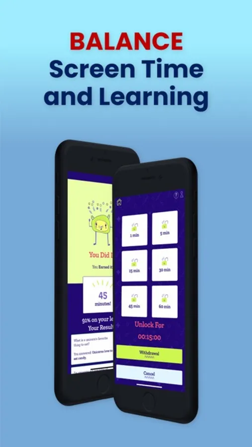 Your device will automatically block apps and internet access until your child completes educational exercises. No more need to nag your kids to study, just simply set the app up and stop stressing.