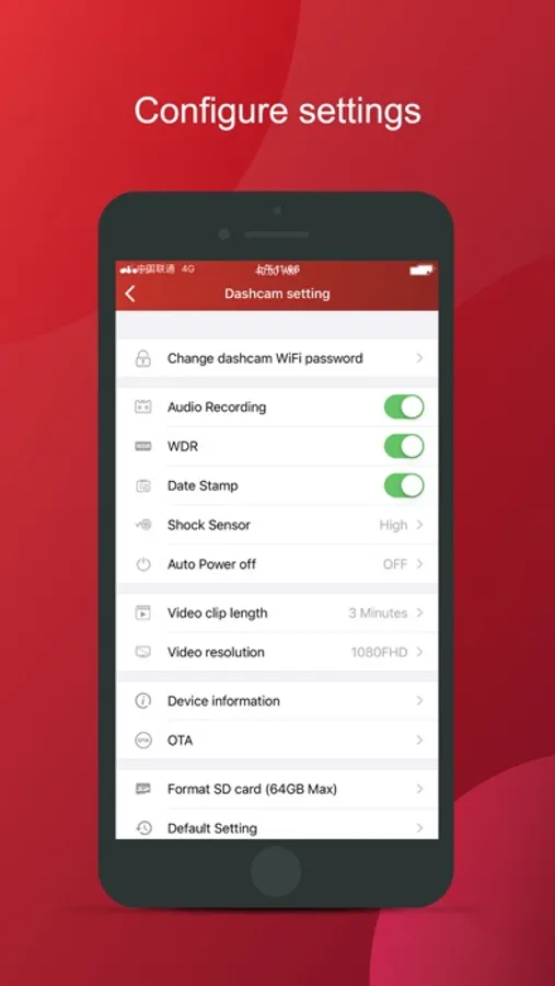 Connect iOS device (within 15ft) to VDR via WiFi to view live video, recorded video and configure settings