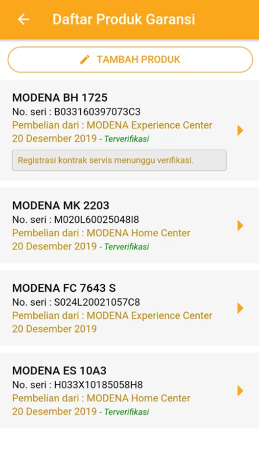 Lebih lanjut, apabila Anda membutuhkan layanan servis produk, hanya dengan registrasi yang mudah di aplikasi maka tim layanan pelanggan MODENA akan segera melayani Anda.