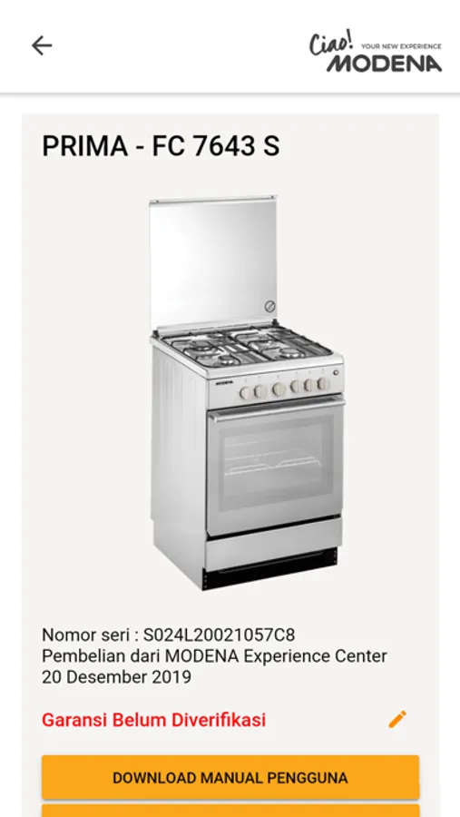 "Perjalanan" produk MODENA Anda dimulai dari registrasi produk dimana Anda berpeluang untuk mendapatkan cashback atas pembelian produk MODENA (apabila registrasi garansi valid dan sudah terverifikasi).