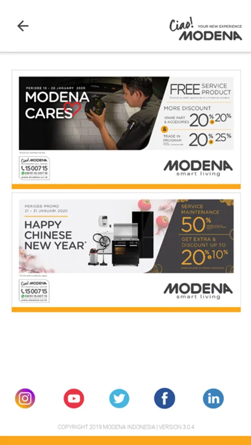 Dapatkan info-info menarik dan berbagai macam promo yang dihadirkan oleh MODENA Indonesia di aplikasi ciao MODENA.