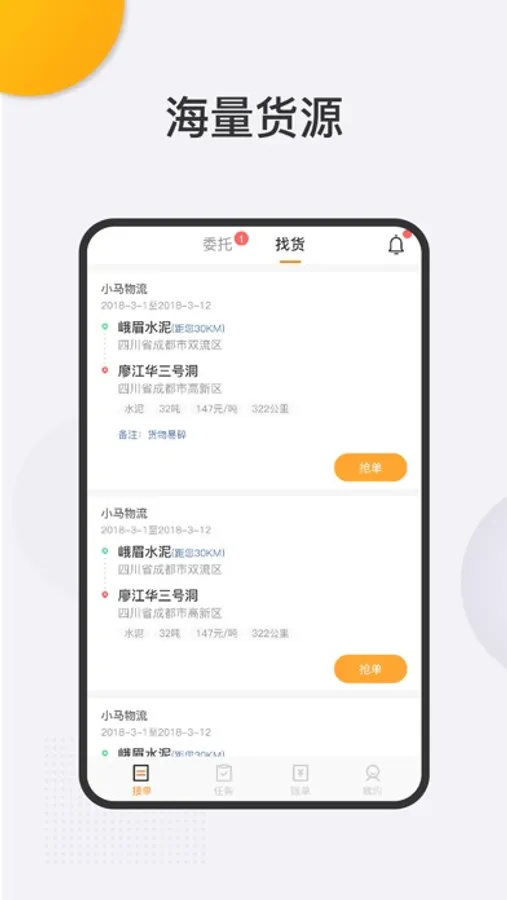 2、司机端功能强大:给指定物流商下单、司机抢单,实时预估发货费用,提供货物跟踪、回款状态、回单状态跟踪功能。