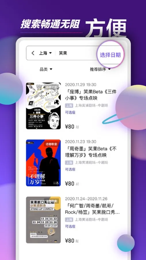 我们提供:你喜欢的演唱会、音乐节、脱口秀、舞台表演、体育比赛、展览等等的门票,我们努力让买票变得更快乐。