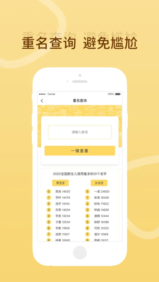 【重名查询】想了解多少人和自己名字一样吗?想避免重名的尴尬吗?想了解同名的男女比例吗?专业重名查询满足您,多维度分类查询。也可解名测名,更有专业解名评分报告供您参考,剖析姓名,为未来助运,让未来转运。