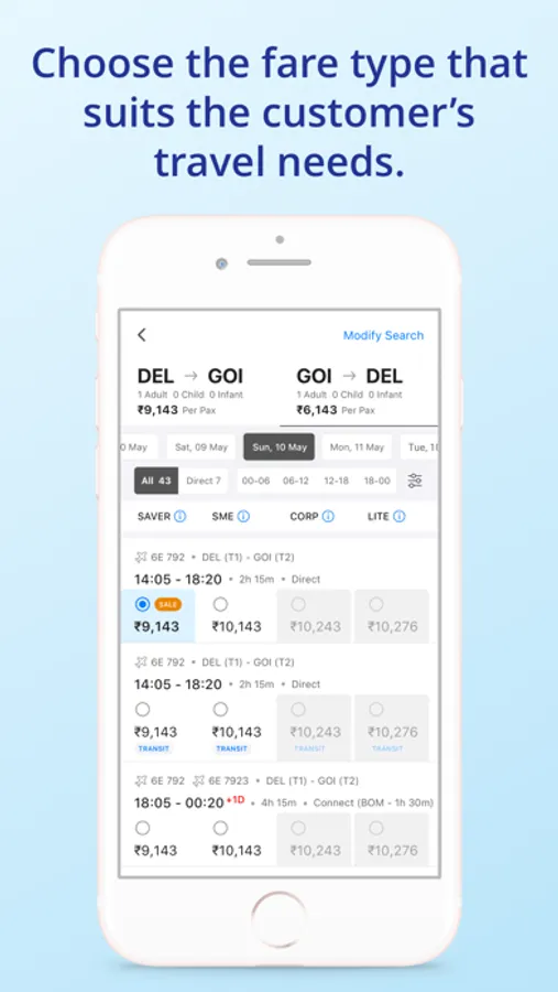Choose from various fare options as per your customer’s travel needs: Corporate, SME, Retail, Saver and Flexi.