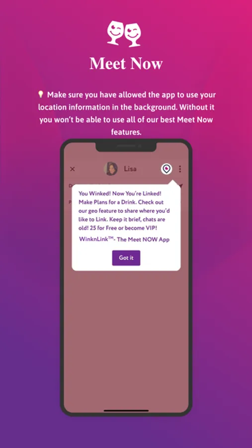 WinknLink is for anyone who wants to meet for a link or link to eat. Unlike other meeting applications, WinknLink is the first app that allows users to meet in real time and instantly. WinknLink allows users to find new friends with a simple wink based on matches with common food and link interests. Our app is created with your link and Food DNA in mind. Wink at people who enjoy the same eats and links as you and even buy a round!