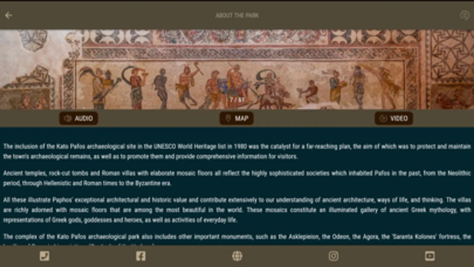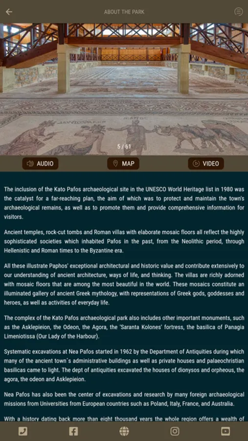 This application provides comprehensive information, videos, photography, 360◦ tours and audio tours about the UNESCO Pafos Archaeological Park, Medieval Castle and Tombs of the Kings!