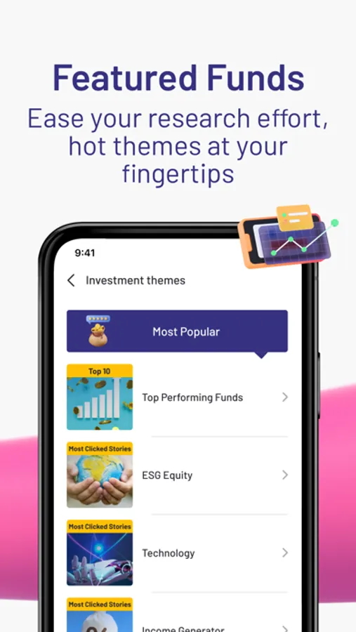 WeLab Bank offers two ways of fund investing. 1) Featured funds: Select your funds from a list of popular funds from global fund houses 2) Digital Wealth Advisory: Receive personalized portfolios recommended by our smart system.