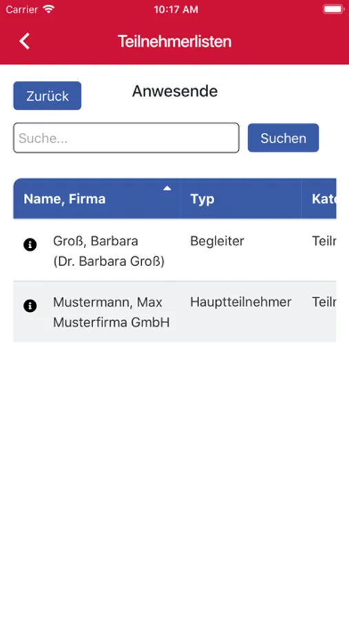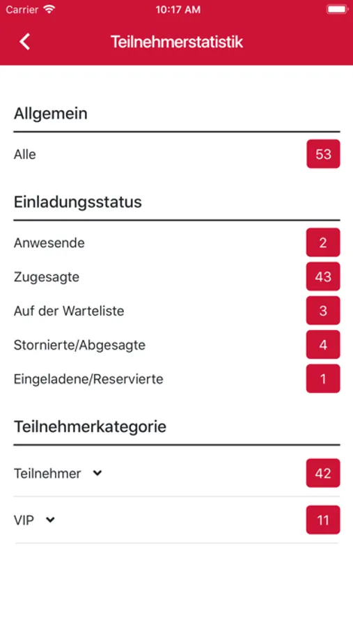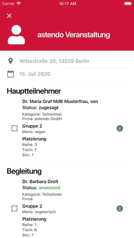 - Teilnehmerlisten: Abruf von Teilnehmerlisten nach definierten Kriterien (Einladungsstatus oder Teilnehmerkategorie) und detaillierten Informationen zum Teilnehmer, wie z.B. Platzierung, Essenswünsche, Begleitpersonen o.ä.)