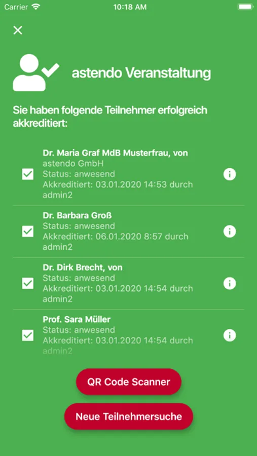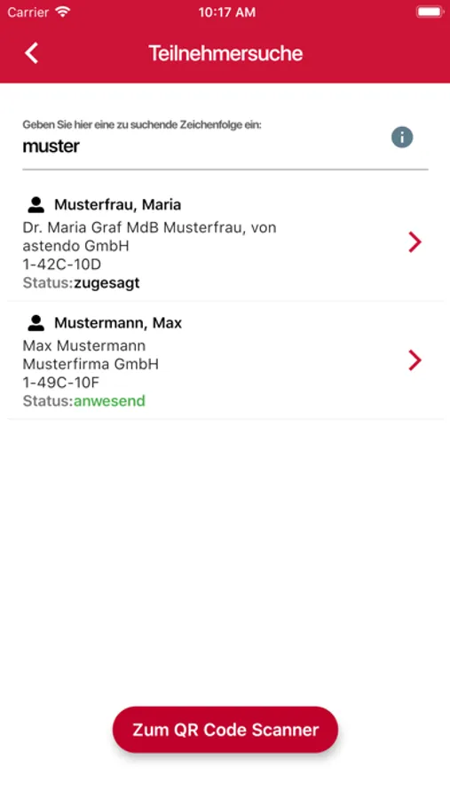 - Akkreditierungsfunktion zur Erfassung von Anwesenheiten der Teilnehmer vor Ort. Dazu können QR-Codes abfotografiert werden oder per Tastatur nach Teilnehmern gesucht werden.