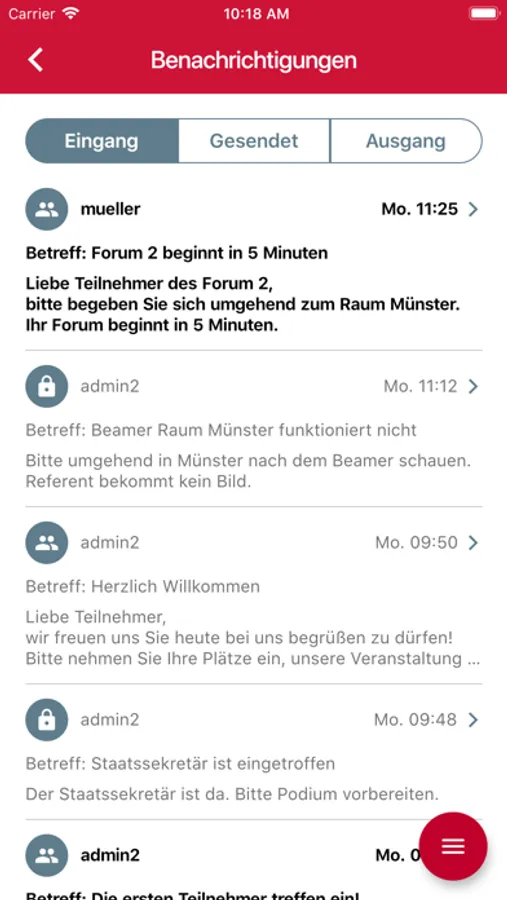 - Benachrichtigungen für Teilnehmer (wie zum Beispiel Ortswechsel und Absagen) oder für den internen Austausch von wichtige Informationen zur Veranstaltung mit anderen Nutzern der adminApp.