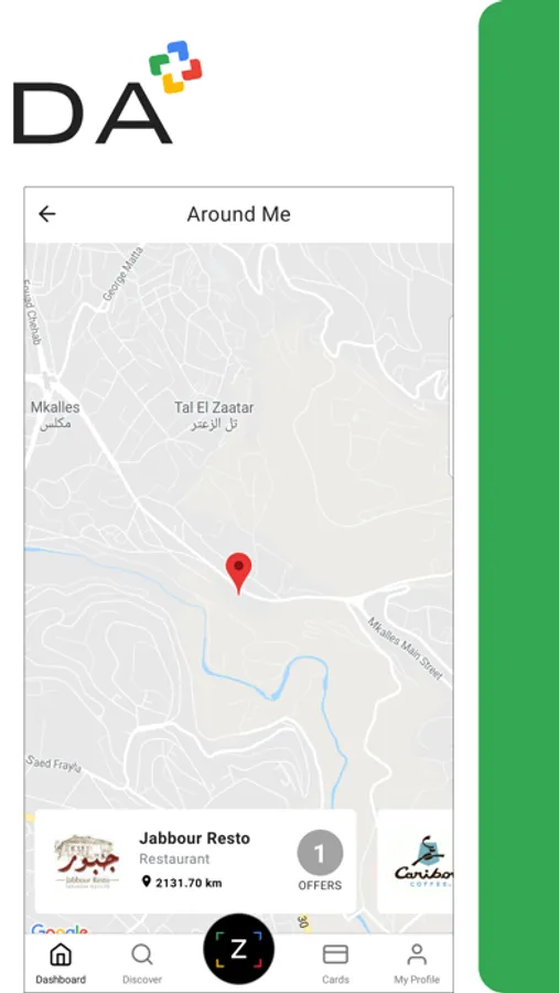 The Around Me feature on the dashboard shows all shops around the user to choose from. It shows as well, while dragging, the shops location on the map with shop category, distance and offers available on each shop.