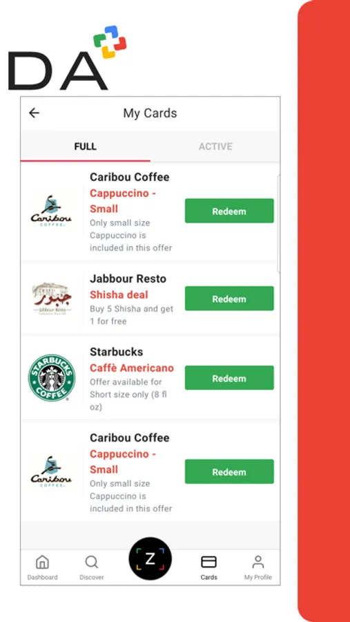 The Cards feature contains the filled cards that already contains a free item to redeem and the open cards that contains stamps but aren’t completed yet. The user can redeem free items from the Full Cards feature.