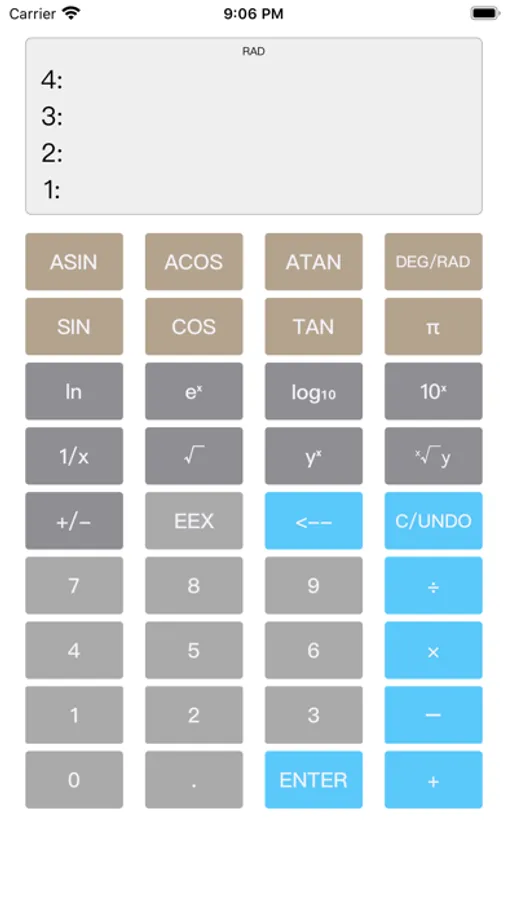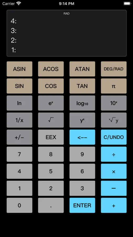 The calculator shows a stack of up to 4 values but can store a large number of numbers (depends on the phone's memory).