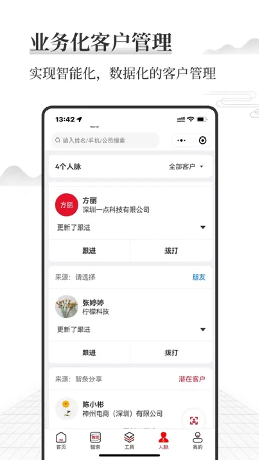 【人脉】手机拍照,自动扫描精准识别名片信息,快速保存通讯录,信息化管理客户分类归纳,客户跟进,客户转让等,并协同业务员进行客户管理。