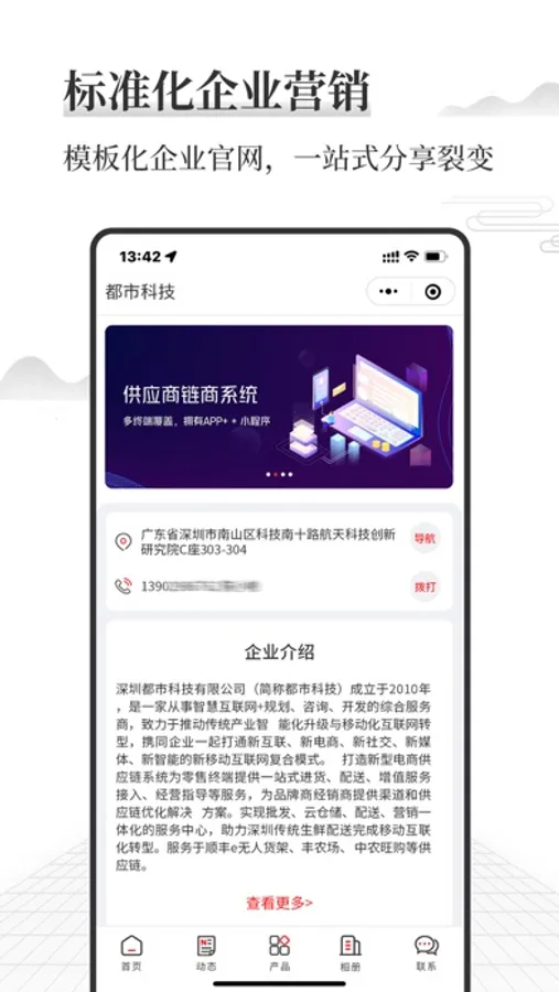 【主页】与团队在线协作、信息管理和可视化视图能力完善企业标准化营销主页,展示企业形象、公司简介、产品中心、企业新闻、产品相册、联系方式、二维码等,并可一键分享推广企业官网。