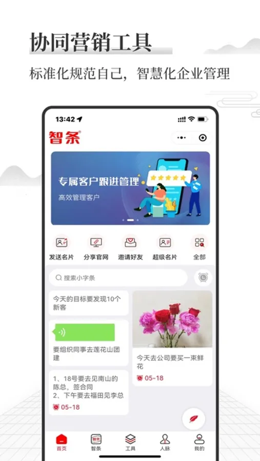智条是新一代的协同营销工具,更轻便、更智能,集便签,产品,相册,资讯,名片于一身,同时提供人脉客户管理跟进协作系统,一站式提升个人和团队的营销能力和效率,配合日程管理,提供优质的数字信息管理解决方案。