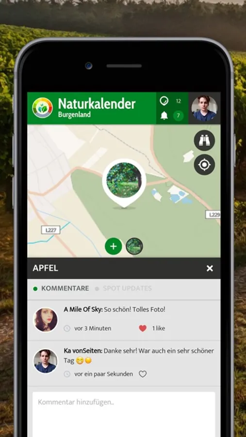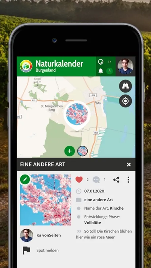 Für die Natur- und Klimaforschung wird es dabei immer wichtiger zu wissen, wann die Pflanzen zu blühen beginnen, fruchten oder das Laub abwerfen und die Tiere aktiv sind. Mit der App kannst du Tiere und Pflanzen fotografieren, eintragen was sie gerade machen und so der Klimaforschung helfen. Der Naturkalender läuft auf der SPOTTERON Citizen Science Plattform.