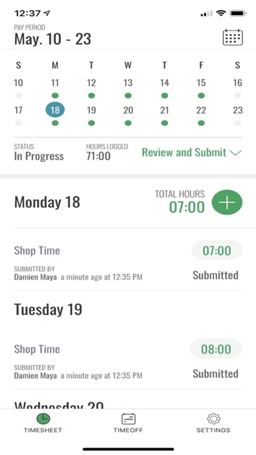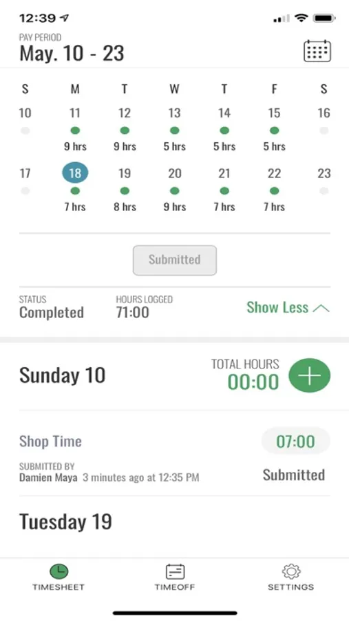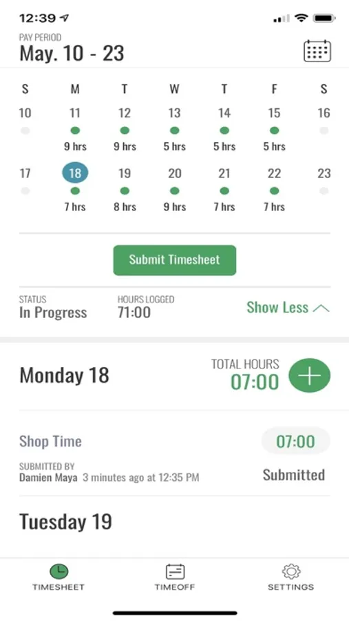 Users can enter billable and non-billable time, request PTO, submit timecards