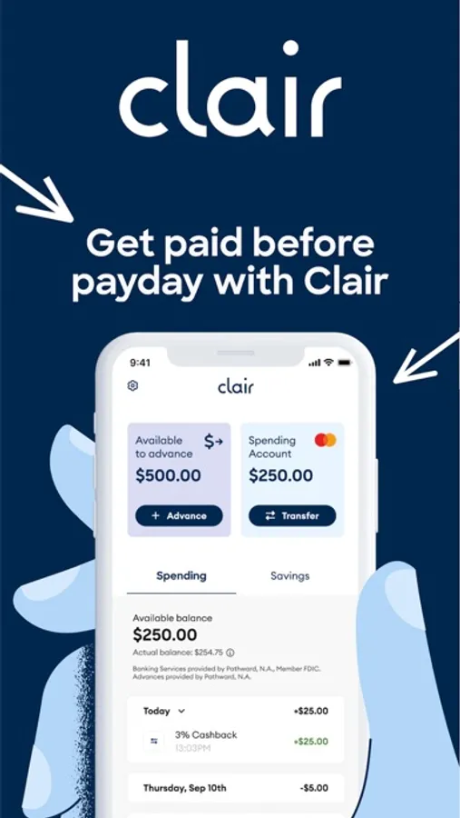 Clair is a banking app that gives you access to a portion of your earnings before payday. When you open a Clair Spending Account, held at Pathward® N.A, Member FDIC, you’ll enjoy on-demand pay with access to fee-free wage advances, an FDIC-insured* Spending and Savings account with no monthly fees, and a Clair Debit Mastercard® to spend your earnings.