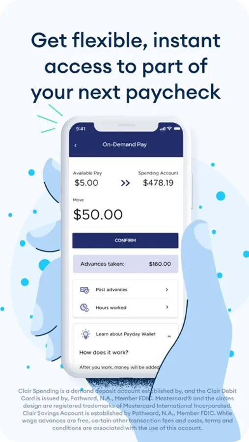 - Quick and easy access: Open a Clair Spending Account and take your first wage advance in the Clair mobile app after setting up a repayment method.