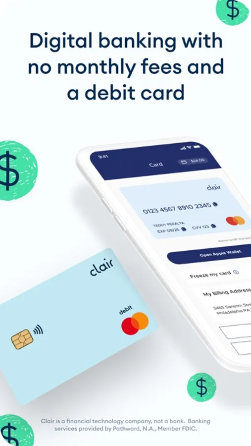 ‡ The Clair Savings Account is established by Pathward, N.A., Member FDIC. Interest is calculated on the Daily Balance of the Savings Account and is paid monthly. The interest rate paid on the entire balance will be 1.98% with an annual percentage yield (APY) of 2%. The interest rate and APY may change. The APY was accurate as of 11/04/22. No minimum balance necessary to open the Savings Account or obtain the yield. You must have or obtain a Spending Account in order to obtain and open a Savings Account, and you must be the primary accountholder of your Spending Account. Savings Account funds are withdrawn through the Spending Account, and transaction fees could reduce the interest earned on the Savings Account. Funds on deposit are FDIC-insured through Pathward, N.A., Member FDIC. For purposes of FDIC coverage limit, all funds held on deposit by the accountholder at Pathward, N.A., will be aggregated up to the coverage limit, currently $250,000.00.