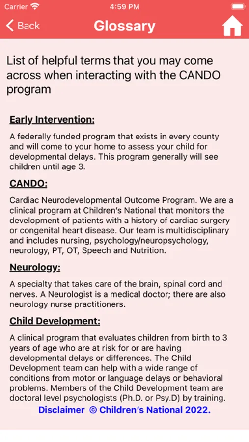 Research shows that patients with congenital heart disease (CHD) who have undergone cardiac surgery are at a higher risk for developmental delay, learning differences and behavioral issues. The goal of this app is to provide awareness of important developmental milestones for families served by CANDO, our neurodevelopmental follow-up program for children with CHD. We hope this educational tool will help CANDO families connect with us, and seek prompt early intervention should a concern arise.