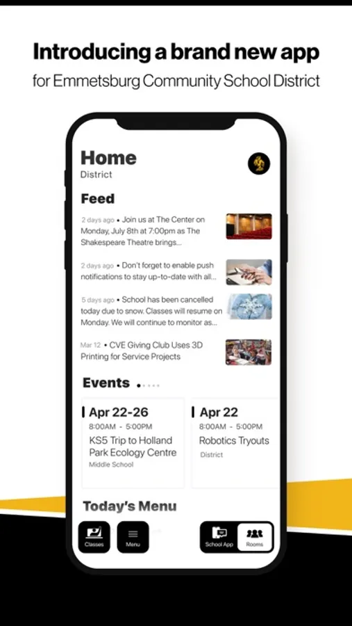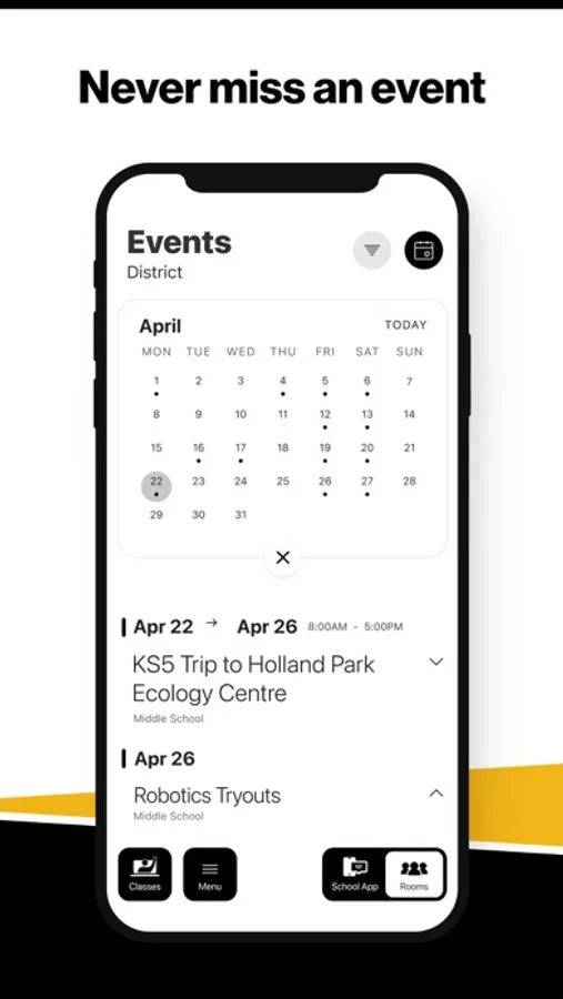 The event section shows a list of events throughout the district. Users can add an event to their calendar to share the event with friends and family with one tap.