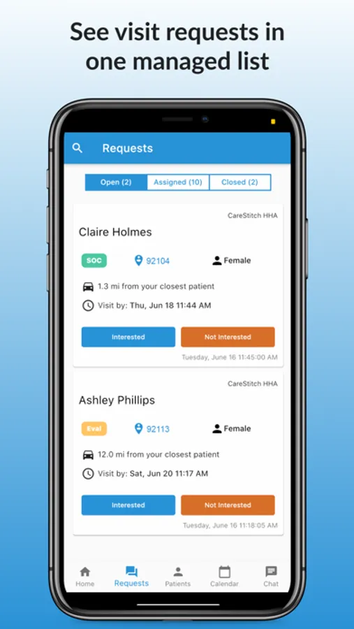 Coordinate with your peers through secure, HIPAA compliant chat. Leave shared notes about a patient so that the team knows what to expect. Get notified when there are new requests for patient care, and accept cases that fit you best.