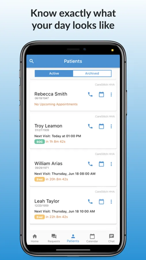 It starts with today’s appointments, and ends with excellent care. Use the appointments screen to know exactly what your day looks like. Check off each visit as you complete them, and pull up patient details right before you go in.