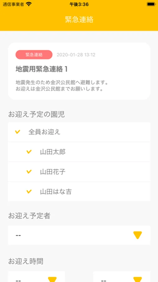 ・お迎えの人・お迎えの時間を園へ送信することができる