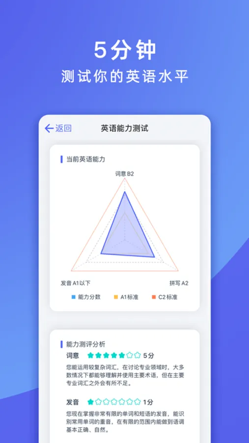 资深算法科学家根据CEFR欧洲语言大纲提供测评算法,准确判断你的单词能力。