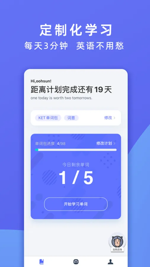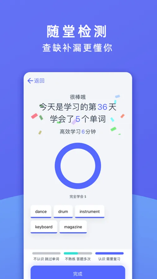 时时记录你的每一个学习行为,根据你的学习行为为你量身定制专属学习计划,推荐最适合你的单词学习内容,让单词学习不再复杂。