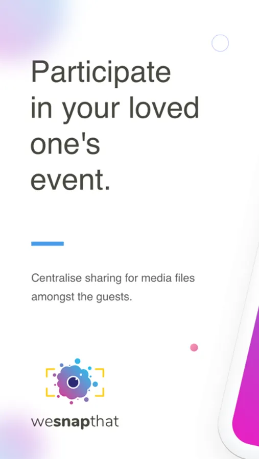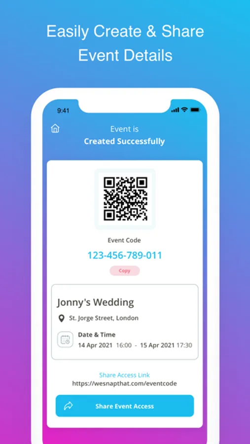 Introducing WesnapThat, the event sharing app that makes it easy for anyone to discover, create, and share events with friends and family. Our unique one-link sharing feature allows you to share an event with just one link, simplifying the process of inviting others. Plus, with our user-friendly interface and intuitive navigation, you'll be able to find and create events quickly and easily.