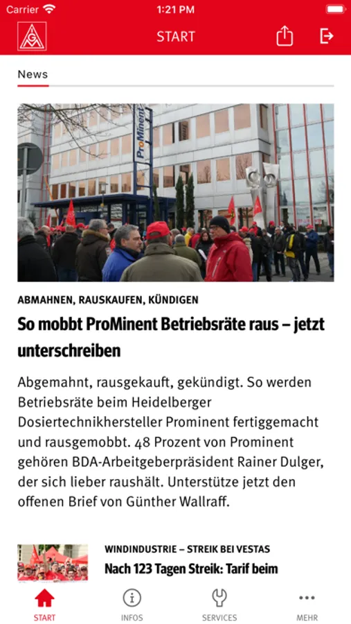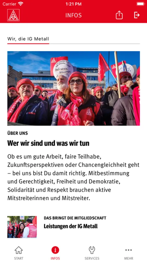 Die IG Metall-App bietet die neusten Informationen zu Tarifverhandlungen, eine Übersicht über die Tarifentgelte, Wissenswertes rund um die Arbeitswelt, einen Schichtplaner sowie Zugriff auf die Online-Services der IG Metall wie die Streikgeldbeantragung.