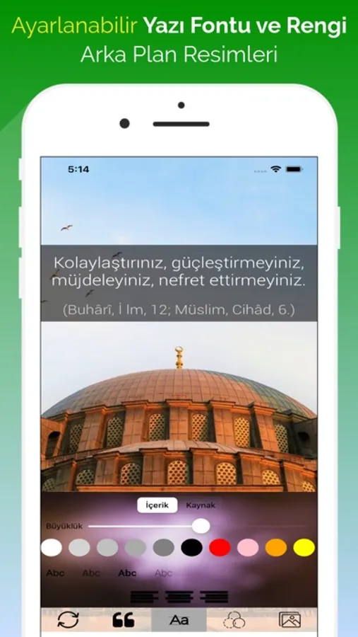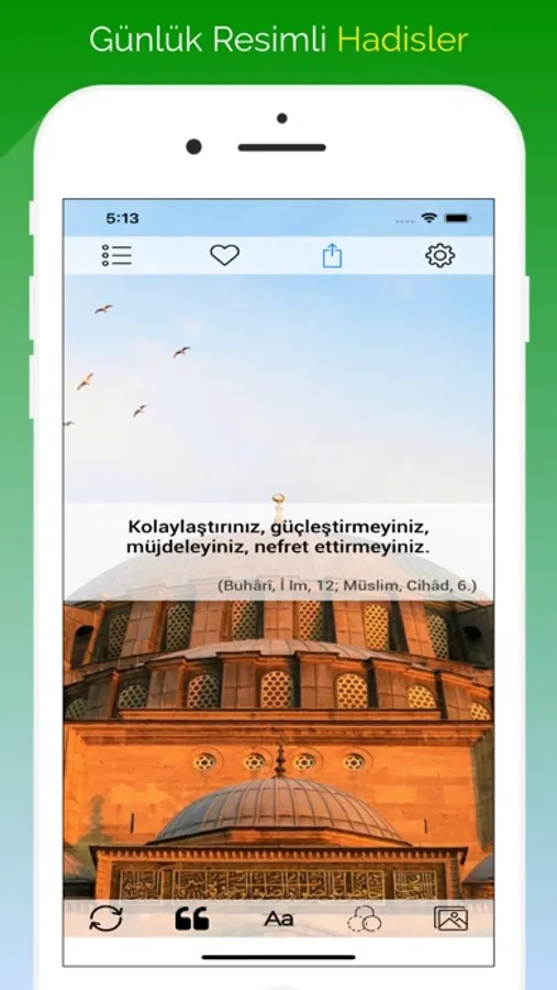 Günlük Resimli Hadis Kütüb-i Sitte uygulaması ile sürekli güncellenen ebedi ahiret yaşamını kazanma yolunda bize rehber olan Peygamber Efendimiz (Sallallahu Aleyhi ve Sellem) (صلى الله عليه و سلم)'in sünneti ışığındaki hadislere, dualara, cuma mesajlarına, dini sözlere günlük erişebilir ve belirlediğiniz bir saatte bildirim alabilirsiniz. Hadislerin yazı boyutunu, fontunu, rengini, arka plan resmini değiştirerek sosyal medyada ya da arkadaşlarınızla paylaşabilirsiniz.