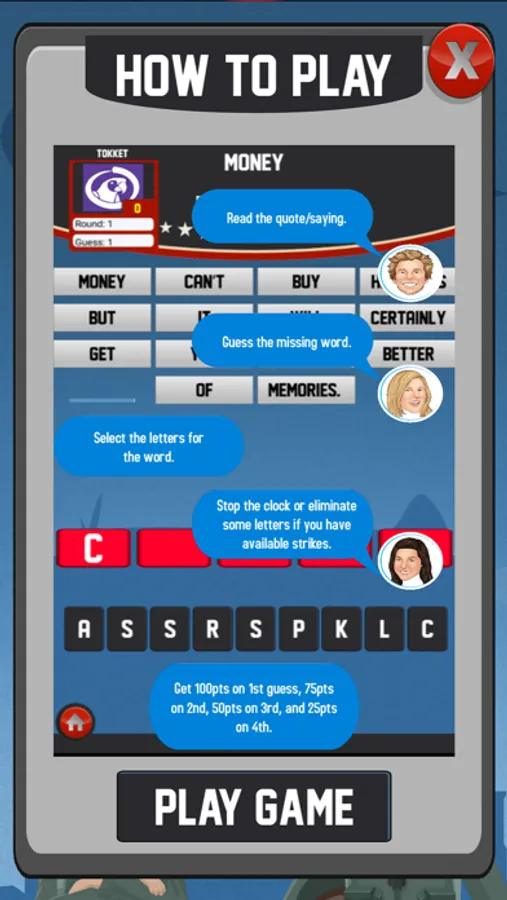 Tok Blitz is the inspirational and motivational quotes game! Play the game by correctly spelling the word that fills in the blank inside the quote. You are racing against time, so strike out the word quickly!