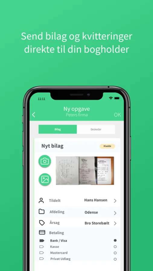 Azets Scan er din nemme løsning til at håndtere bilag. Du kan tage billeder af dine bilag eller fakturaer og sende dem direkte til din bogholder med mulighed for at vælge afdeling, projekt, årsag og betalingsmetode.