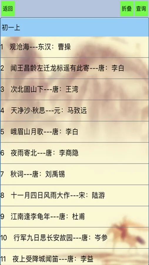 6.提供古诗查询功能,可以根据作者,诗句,题目三种方式查询,便于随时查阅。