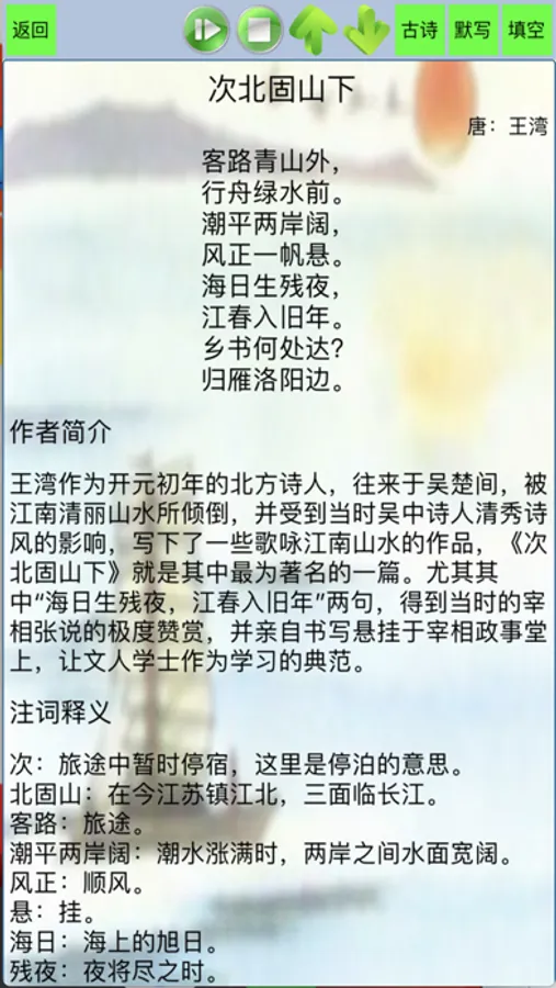 2.古诗文模式下提供了古诗原文并标注拼音,古诗注解。并且根据每首古诗配了精美背景,和古诗文合理匹配,增加阅读兴趣。
